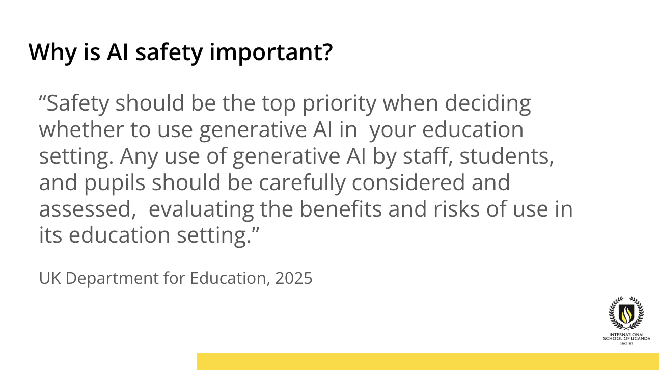 We then discussed why AI safety matters, exploring how rapidly changing technology requires new skills and awareness for both students and adults.