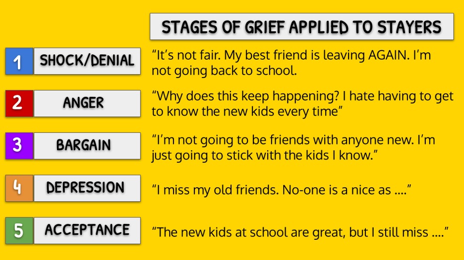 Catherine talked us through the experiences, thoughts and emotions our children who stay will work through. She then shared the NEST framework to help children develop strategies to work through the stages of grief when friends are leaving.